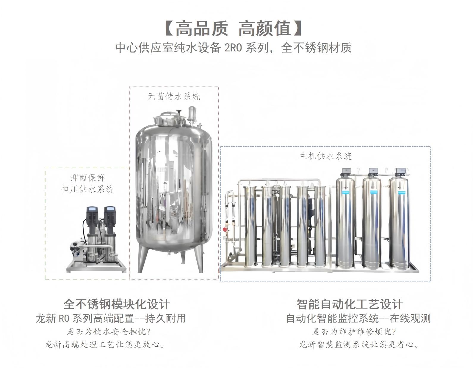產品概述:中心供應室純水設備2RO系列原水水質是市政自來水、水質指標符合生活飲用水衛生標準;產水水質符合《醫院消毒供應中心第1部分:管理規范》WS 310.1-2016用水指標。