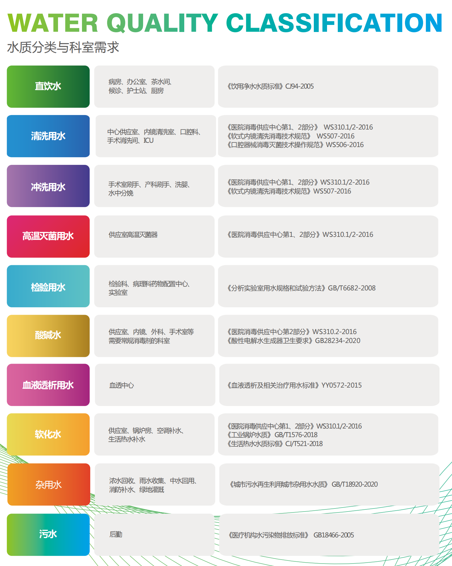 (1)水質(zhì)分類(lèi)與科室需求:用水主要應(yīng)用哪些方面,龍新會(huì)根據(jù)不同科室需求用水的國(guó)家及行業(yè)標(biāo)準(zhǔn)的產(chǎn)水水質(zhì)要求,為客戶(hù)量身定制合適的解決方案。