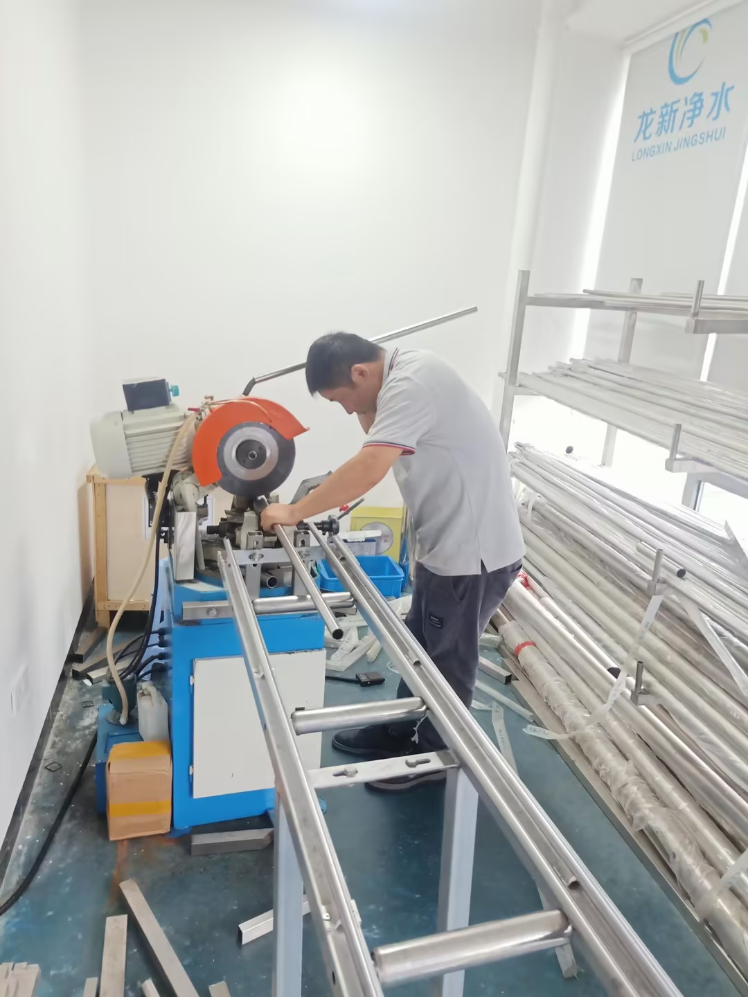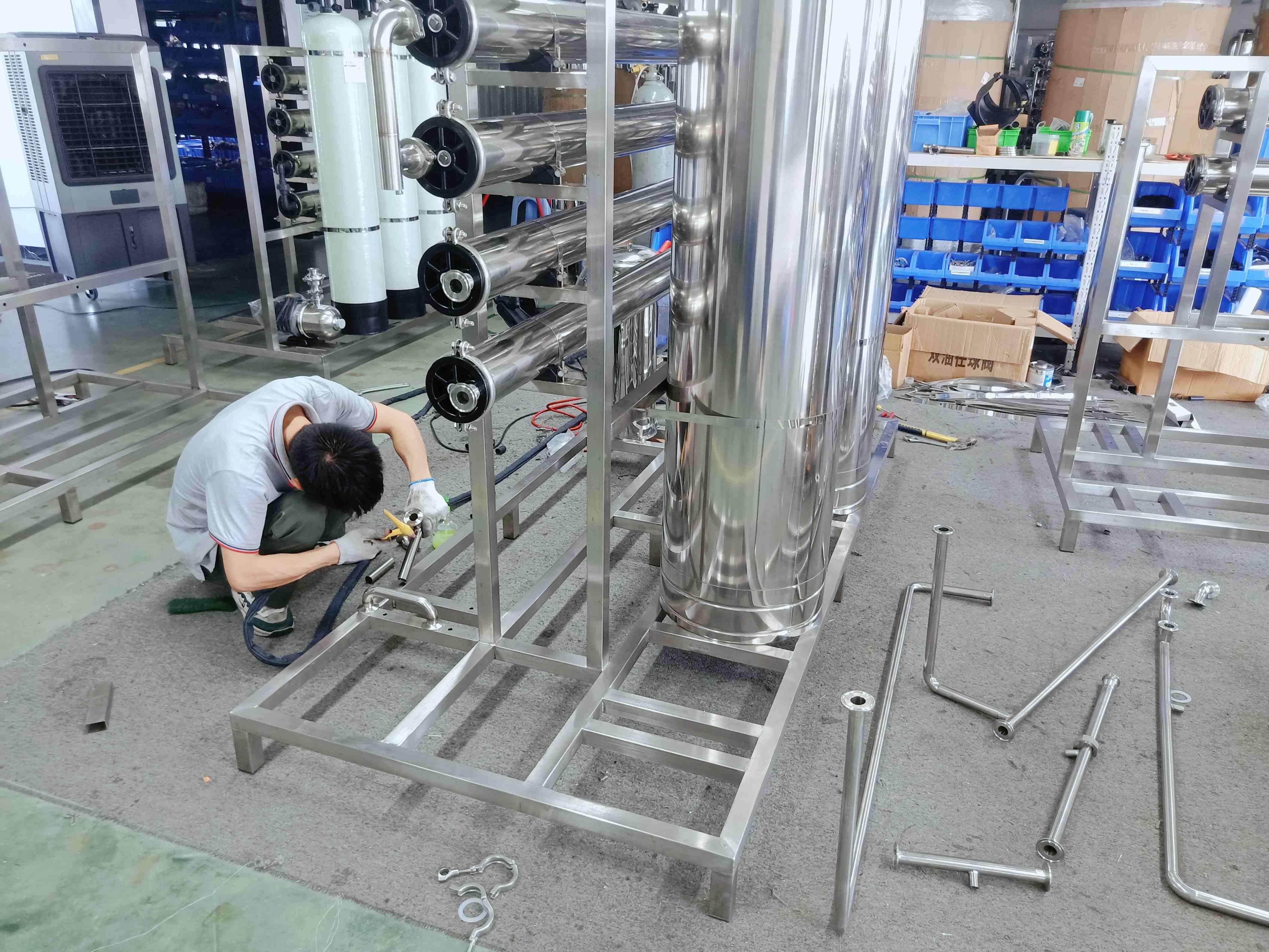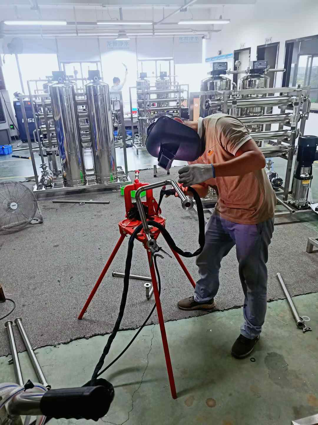 走進生產車間,機器的轟鳴聲不斷,員工們正緊張有序地在各自的工作崗位忙碌著,下料、沖壓、焊接、安裝、接線、調試、打包等工序有條不紊,一套套水處理系統正源源不斷地生產出來,生產現場秩序井然。
