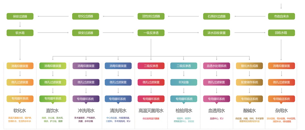 醫(yī)院集中分質(zhì)供水系統(tǒng)是用一套水處理系統(tǒng)對(duì)自來(lái)水進(jìn)行深度處理,使其達(dá)到各科室可直接使用的水質(zhì)標(biāo)準(zhǔn),再分別由專用管網(wǎng)供給各科室使用的供水系統(tǒng)。